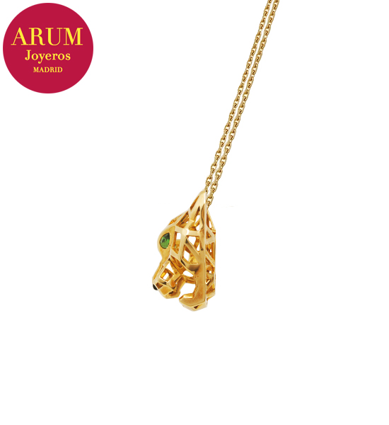 Descripción: Collar de la prestigiosa firma de joyería Cartier, realizado en oro amarillo de 18K, granates tsavoritas en los ojos y onix en el hocico. La cabeza de pantera mide 2,8 por 2,2 cm. La cadena mide 65 cm de largo. Peso 30, 2 grs.