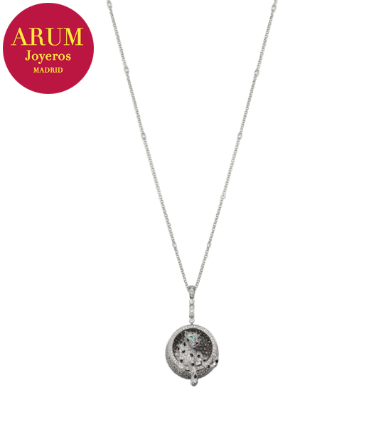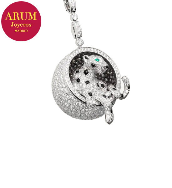Descripción: Collar Panthère de Cartier realizado en oro blanco de 18K, engastado con dos ojos de esmeralda, hocico y manchas de ónix y 867 diamantes talla brillante para un total de 11,15 quilates. El colgante mide aprox 3 cm, y la cadena tiene un largo de 66 cm.