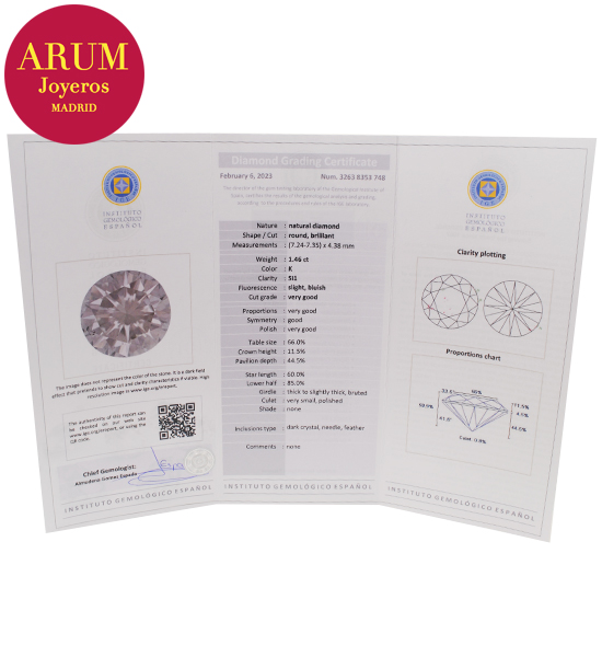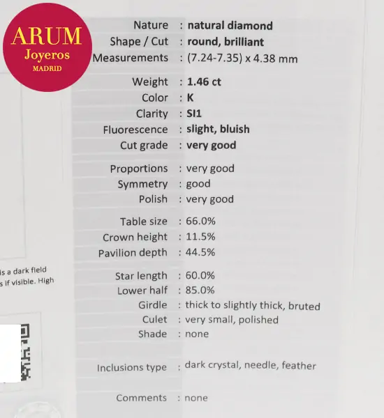Producto: Diamante para Inversión 1.46 qts. Referencia Tienda: RAJ2266 Talla: Brillante Peso: 1.46 qts. Color: K Pureza: SI1 Se acompaña con certificado del IGE (Instituto Gemológico Español)