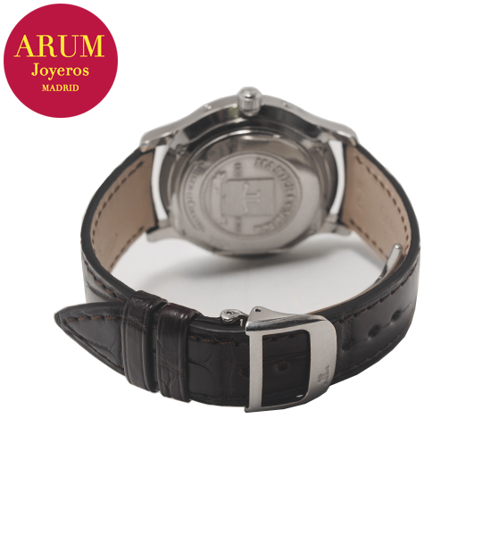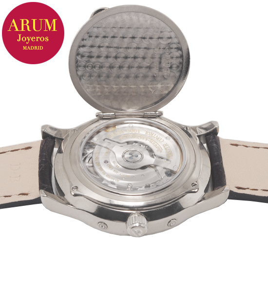 Otras especificaciones :triple calendario, fecha, día de la semana, mes, fase lunar, segundero pequeño, deployant en oro blanco de 18K.