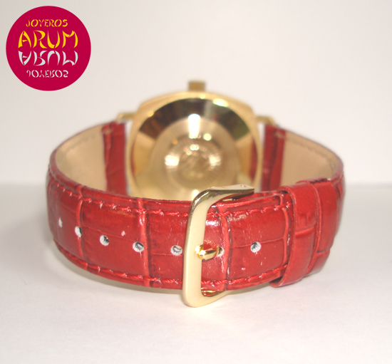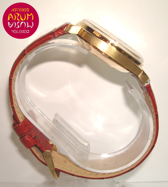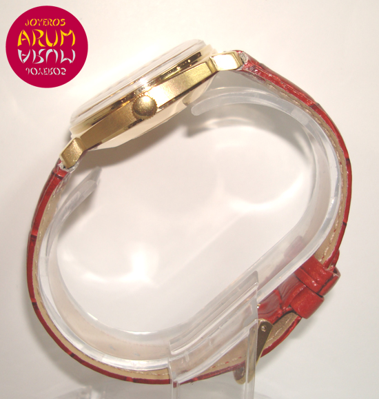 Descripción :oro amarillo, esfera plata, cristal plástico, movimiento automático, segundero central, fecha a las tres, diámetro 34 mm, correa de piel roja, cierre hebilla, años 70.
