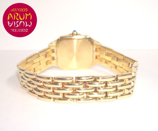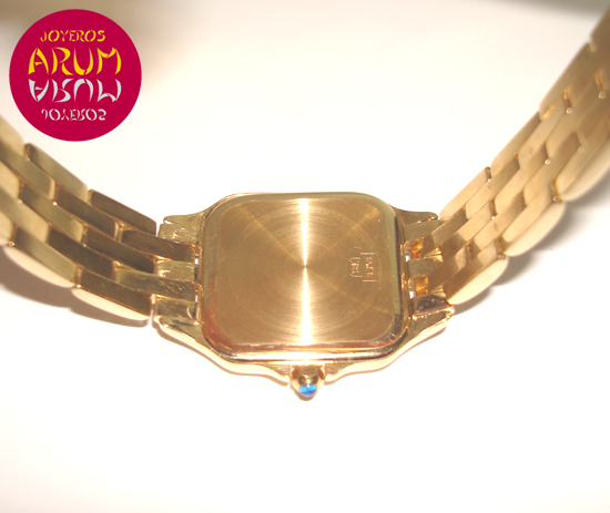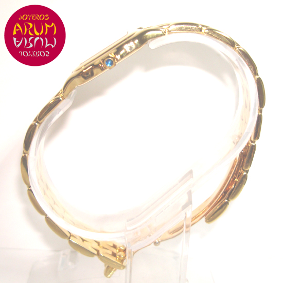 Descripción :reloj de señora, oro amarillo, esfera blanca con números romanos, cristal de zafiro, movimiento cuarzo, agujas de acero azulado, corona atornillada, diámetro 22 mm, sumergible 30 metros, correa de oro amarillo, cierre desplegable oculto.