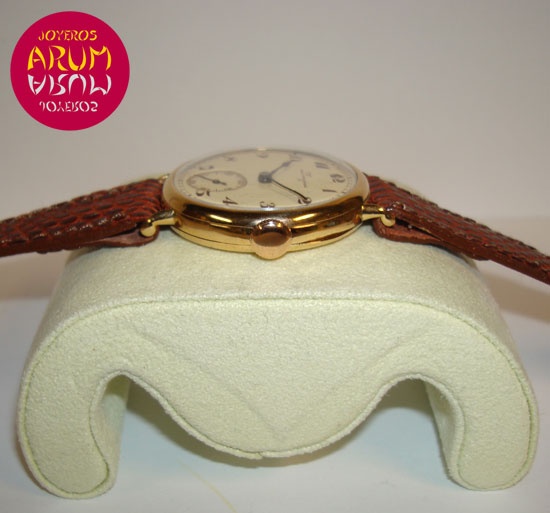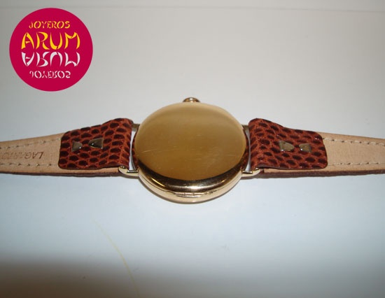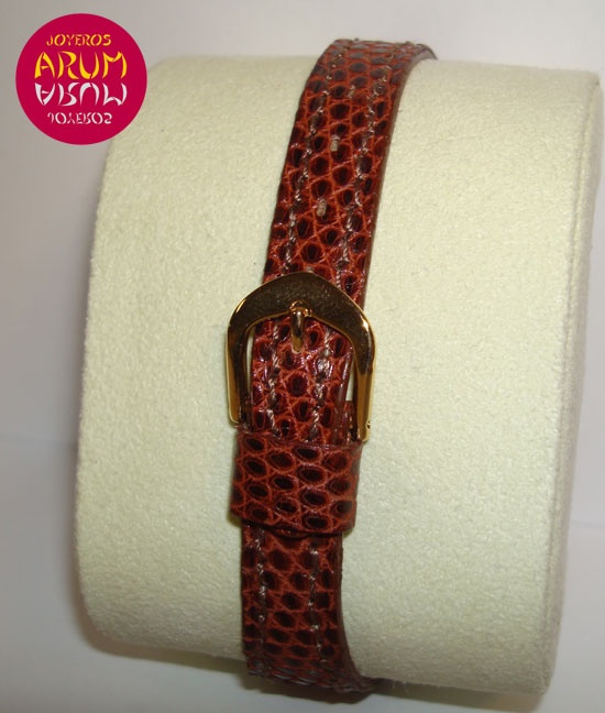Descripción :oro amarillo, esfera beige con números árabes, cristal de plástico, movimiento cuerda manual, agujas de acero azulado, segundero central, diámetro 32 mm, correa de piel marrón, cierre hebilla.