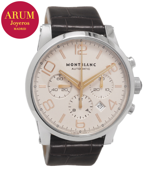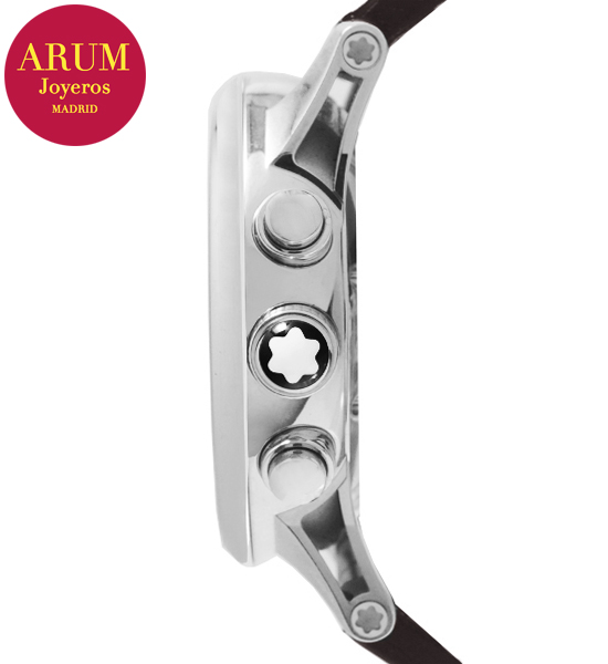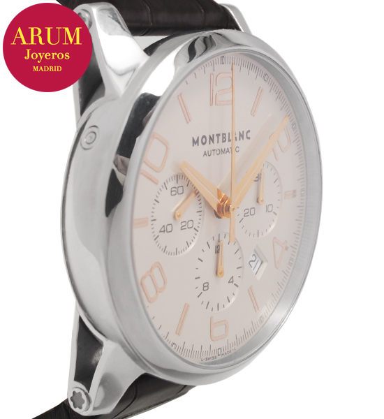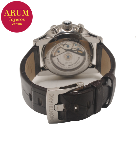 Otras especificaciones :cronógrafo, fecha, segundero pequeño a las nueve, agujas y números dorados, tapa trasera transparente, corona con la estrella de Montblanc.
