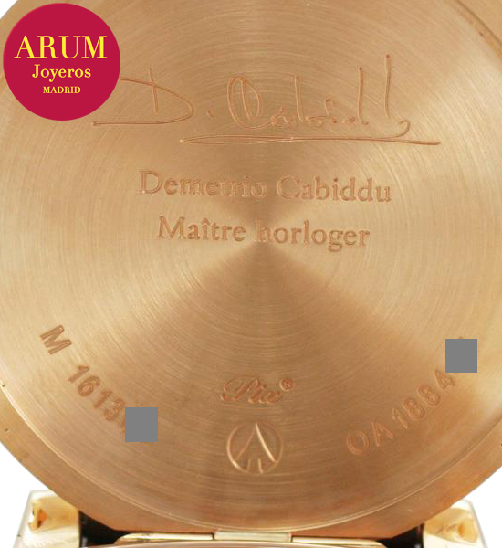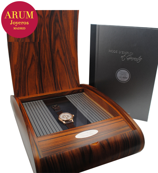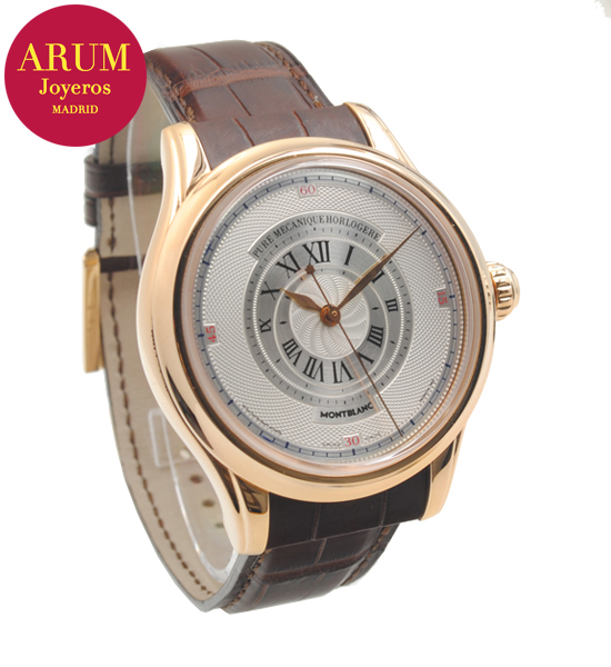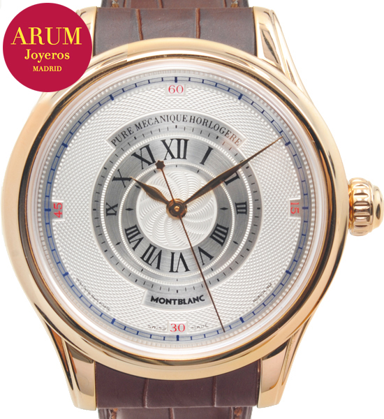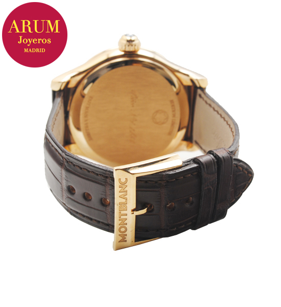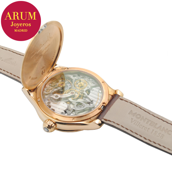 Otras especificaciones :serie limitada a 58 piezas, calibre MBM16.18, reserva de marcha de 50 horas, puesta a cero del segundero al tirar de la corona, , esfera guilloseada en oro de 18K con grabado circular plateado artesanal, corona con el emblema de Montblanc, cuvette abovedada con mecanismo patentado articulado por las asas firmado por el maestro relojero Demetrio Cabiddu, hebilla en oro de 18K.
