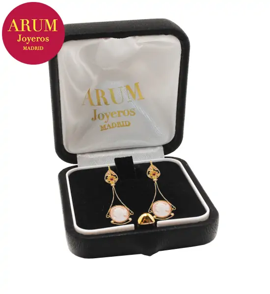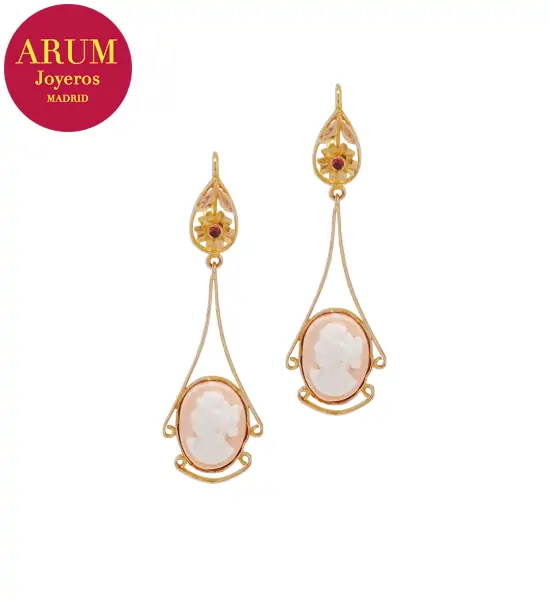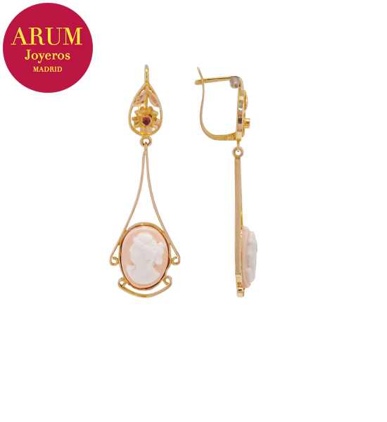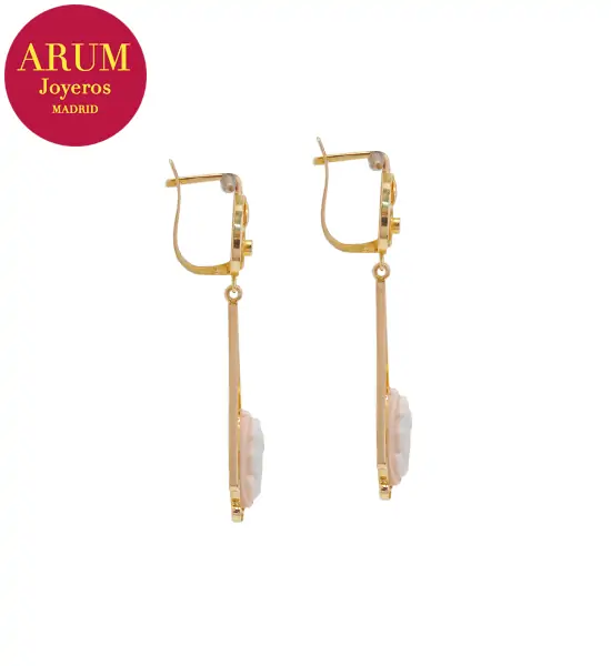 Descripción: Pendientes realizados en oro amarillo de 18K con camafeos realizados en nacar. Los pendientes miden 5 cm de largo y pesan 5,56 grs.
