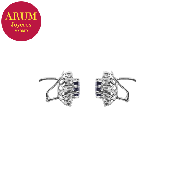Descripción: Pendientes realizados en oro blanco de 18K con un zafiro de 0,80 qts y diez brillantes de 0,05 qts cada uno (Color G – Pureza VS1). Los pendientes miden 1,4 cm. Peso 7,5 grs.