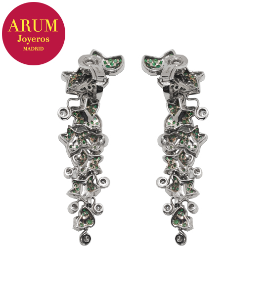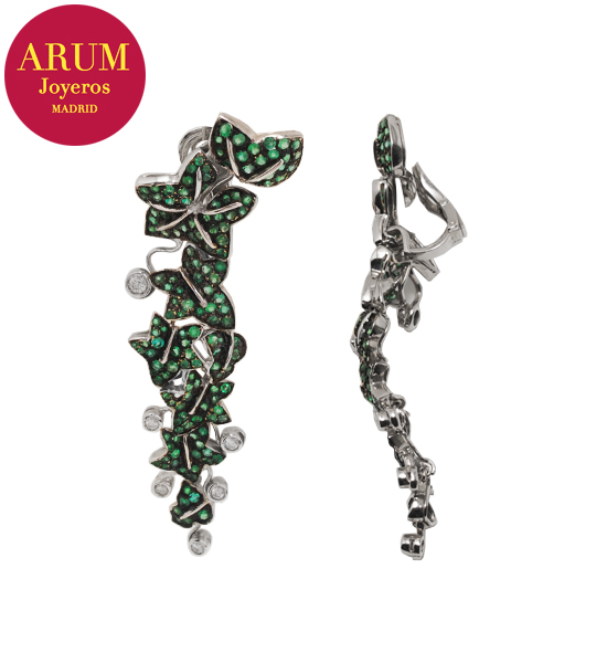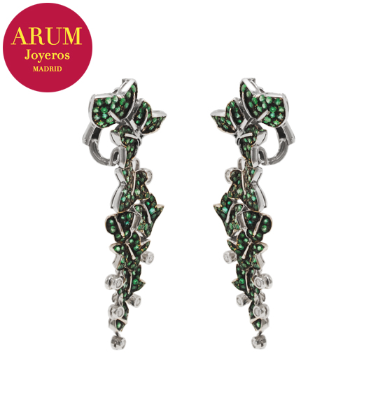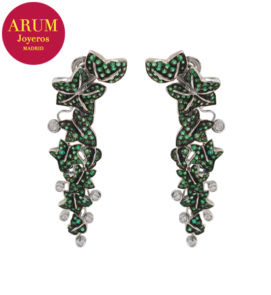 Descripción: Pendientes largos con motivos florales de la prestigiosa firma de joyería Yanes, realizados en oro blanco de 18K, brillantes y esmeraldas. El peso total es de 34,9 grs y miden 7,5 cm de largo.