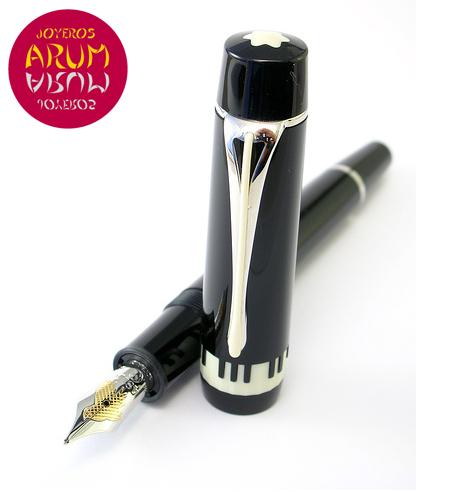 Descripción: Edición especial dedicada al célebre director de orquesta Herbert von Karajan. Cuerpo y capuchón de resina noble negra. Anillo facetado color marfil representando las teclas de un piano. Clip plaqué de platino con incrustación de una batura. Plumín de oro de 18 K rodiado.