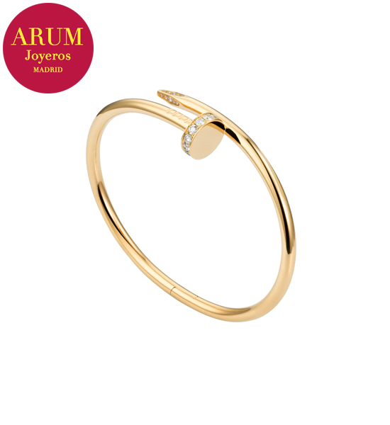 Descripción: Pulsera de la prestigiosa firma de joyería Cartier, perteneciente a la colección Just Un Clou, realizada en oro amarillo de 18K y engastada con 32 diamantes para un total de 0,58 qts. Peso 30,2 grs.