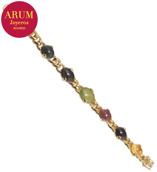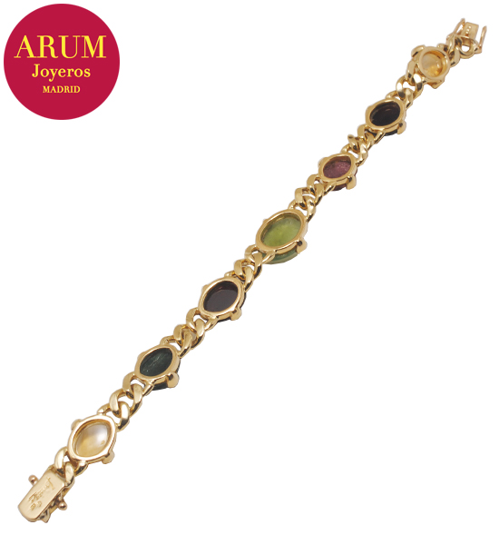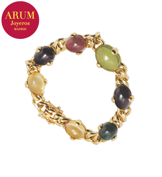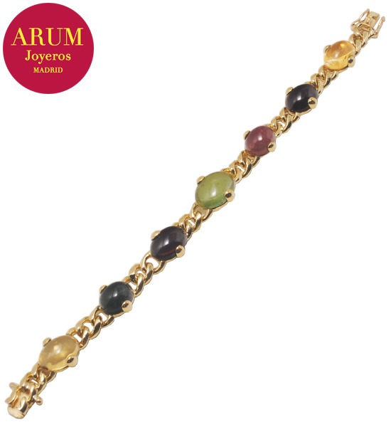 Descripción: Pulsera realizada en oro amarillo de 18K con un citrinos, topacios, amatista, turmalina y granate. Peso 41,38 grs.