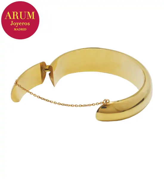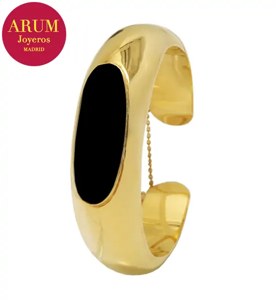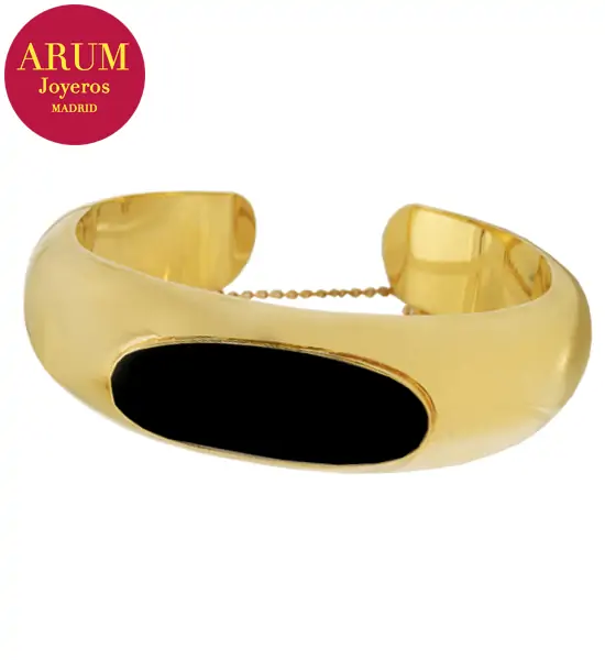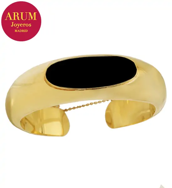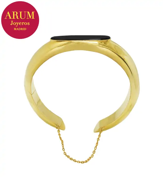 Descripción: Pulsera rígida realizada en oro amarillo de 18K y onix. La pulsera tiene un ancho de 2 cm. Peso 49,15 grs.