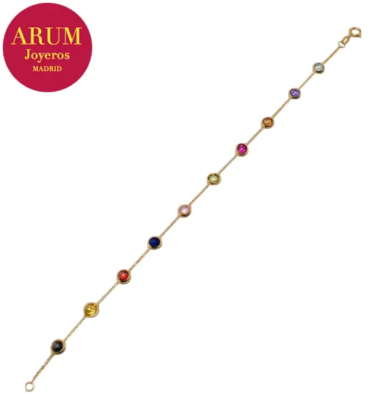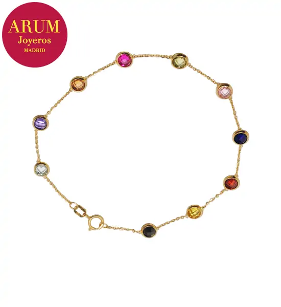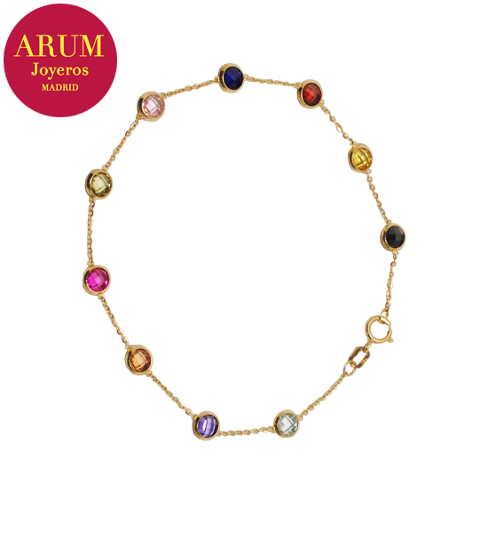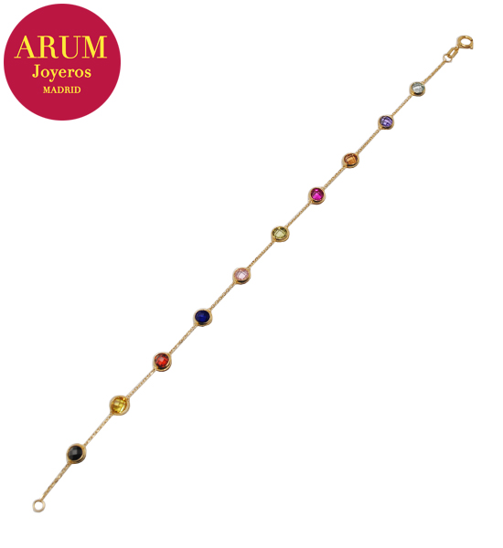 Descripción: Pulsera realizada en oro amarillo de 18K, con piedras preciosas (amatistas, topacios, aguamarinas). La cadena mide de largo 18 cm y pesa 1,89 grs.