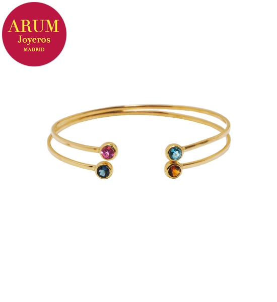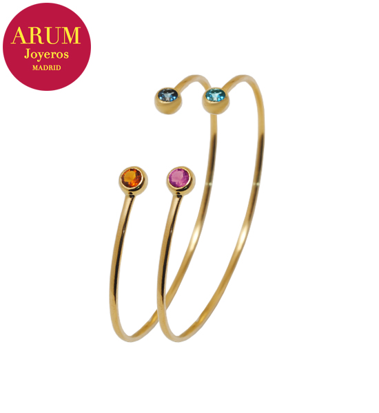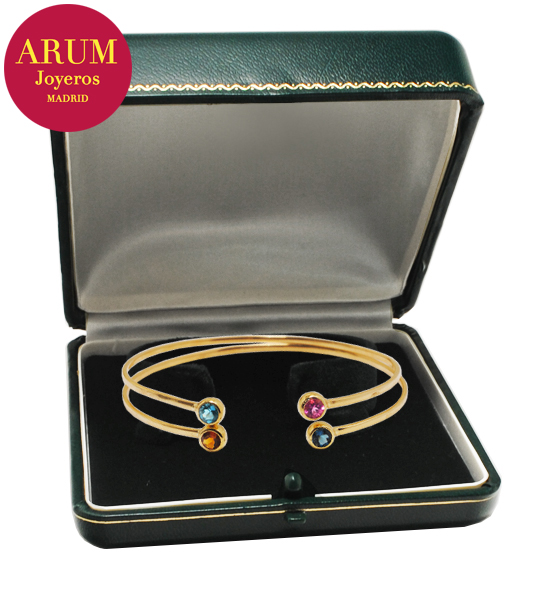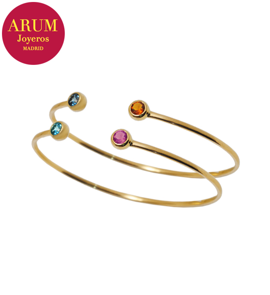Descripción: Pulseras realizadas en oro amarillo de 18K con topacios. El peso de cada pulsera es de 5 grs. y cada una mide 5,5 cm por 4,5 cm aprox.
