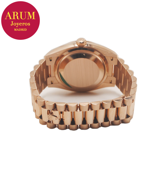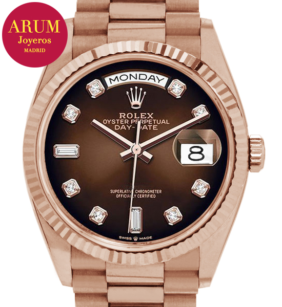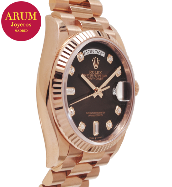 Otras especificaciones :diamantes talla brillante y bagués en la esfera, esfera madreperla, fecha con lupa a las tres, día de la semana a las doce, segundero central, bisel estriado, corona a rosca, anillo de seguridad con número de serie grabado. Año 2022.