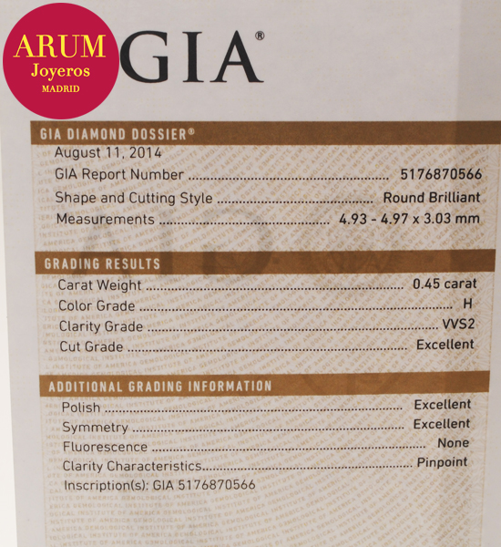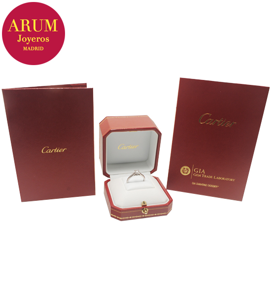 Descripción: Solitario de la prestigiosa firma de joyería Cartier realizado en platino (peso 4,6 grs.) con un diamante talla brillante de 0,45 qts, (Color H, Pureza VS2)