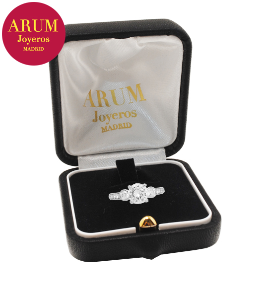 Descripción: Solitario realizado en oro blanco de 18K, engastado con un diamante central talla brillante de 1.00 ct. (Color G, Pureza SI1) con diamantes talla brillante de 0.7 ct. El peso del anillo es de 3.1 grs.