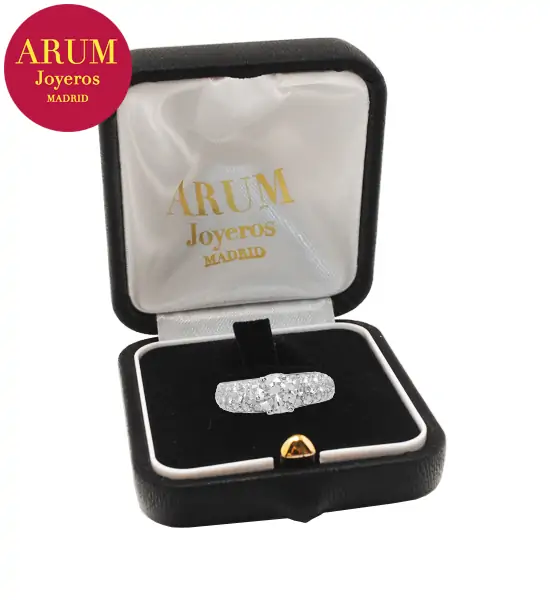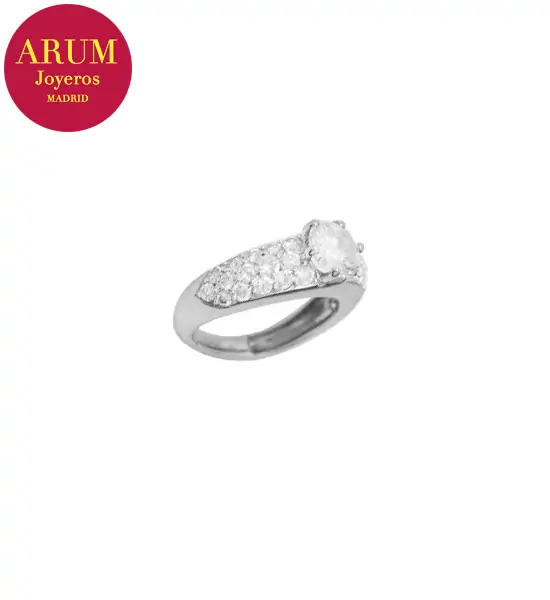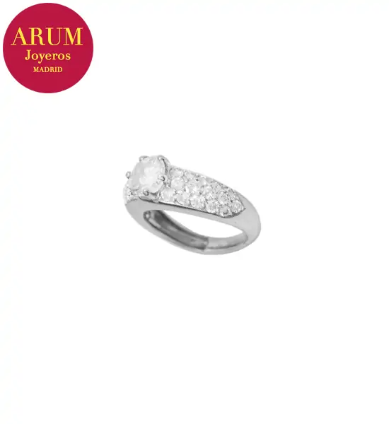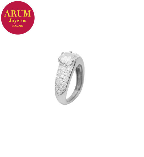 Descripción: Solitario realizado en oro blanco de 18K, engastado con un diamante central, talla brillante, de 1.09 ct (Color I – Pureza SI), con pavé de diamantes talla brillante. El peso del anillo es de 4,6 grs.