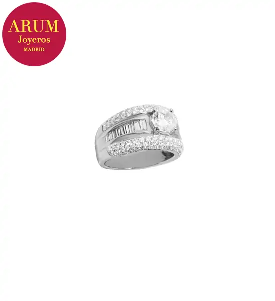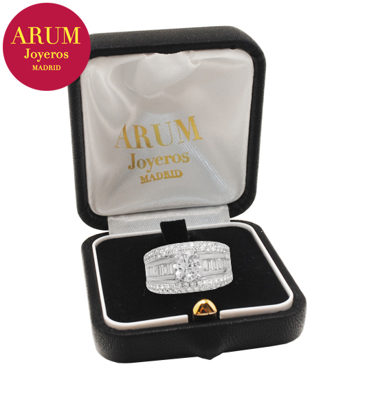 Descripción: Solitario realizado en oro blanco de 18K, engastado con un diamante central, talla brillante, de 1 ct (Color E – Pureza SI), con 114 diamantes talla brillante de 0,88 ct y 16 diamantes talla bagues de 0,63 ct. El peso del anillo es de 11,2 grs.