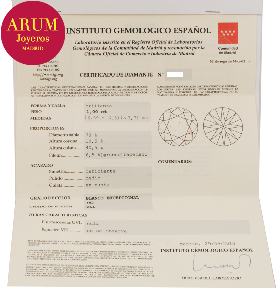 Estado: Nuevo, con certificado del IGE (Instituto Gemológico Español) y estuche de joyería.