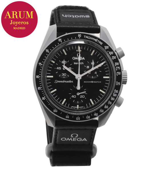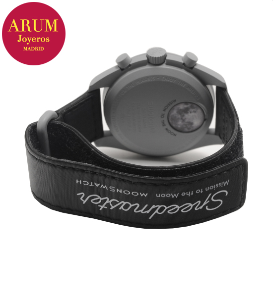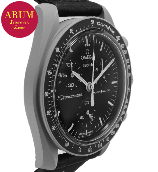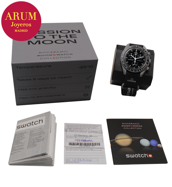 Otras especificaciones :reloj Swatch diseñado en colaboración con Omega, tributo al modelo Speedmaster “Mission to the Moon”, Fathoms, cronógrafo, taquímetro, segundero pequeño a las seis, marcas luminiscentes. Diciembre/2023.