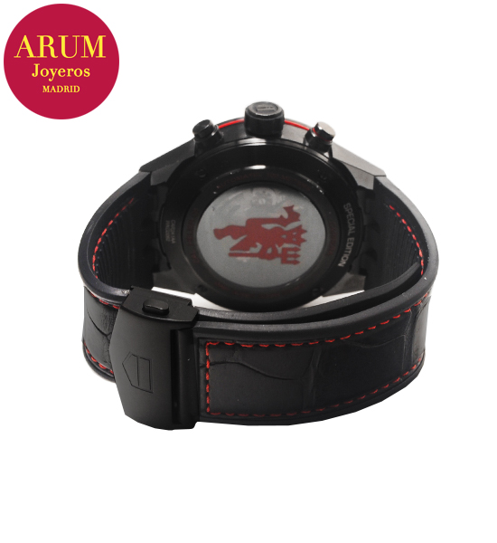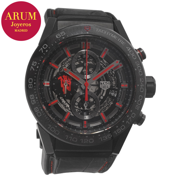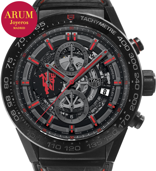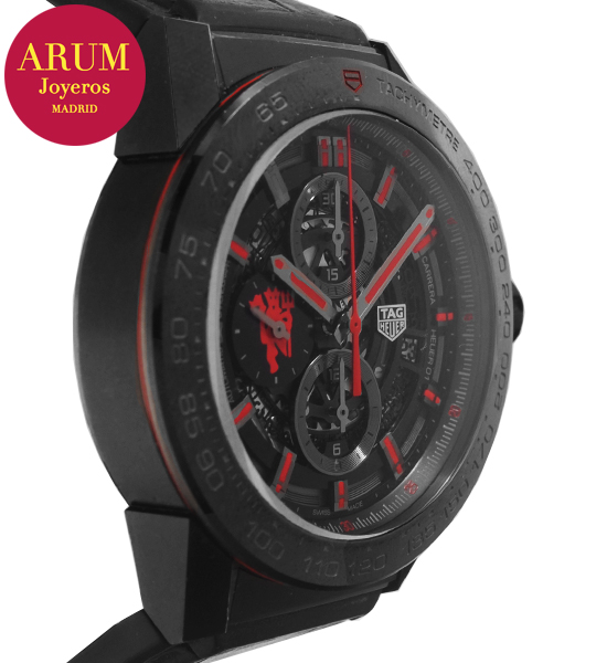 Otras especificaciones :edición especial en colaboración con el equipo inglés de fútbol Manchester United del que es patrocinador, calibre Heuer 01, acero con tratamiento PVD/DLC, bisel cerámico, cronógrafo, taquímetro, fecha, segundero pequeño, corona de caucho, escudo “Diablos Rojos” en la esfera y en la tapa trasera.
