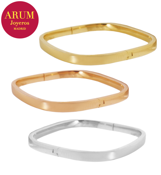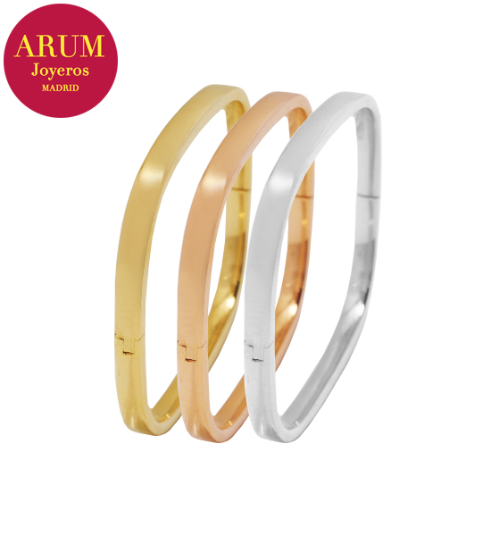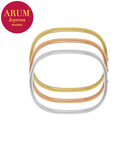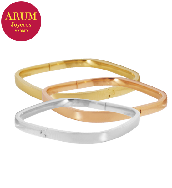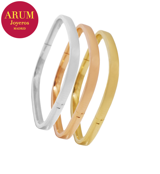 Descripción: Tres pulseras realizadas en oro amarillo de 18K (14,4 grs.), oro rosa de 18K (14,64 grs) y oro blanco de 18K (13,86 grs.). Cada pulsera tiene un ancho de 0,45 mm.