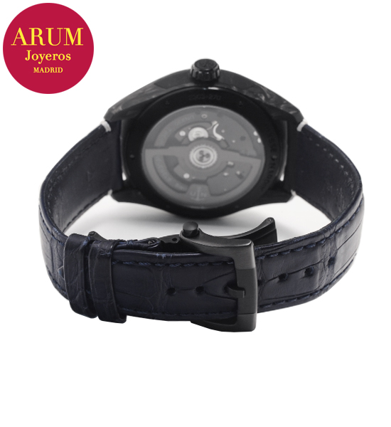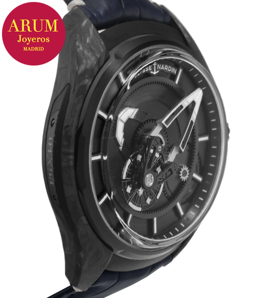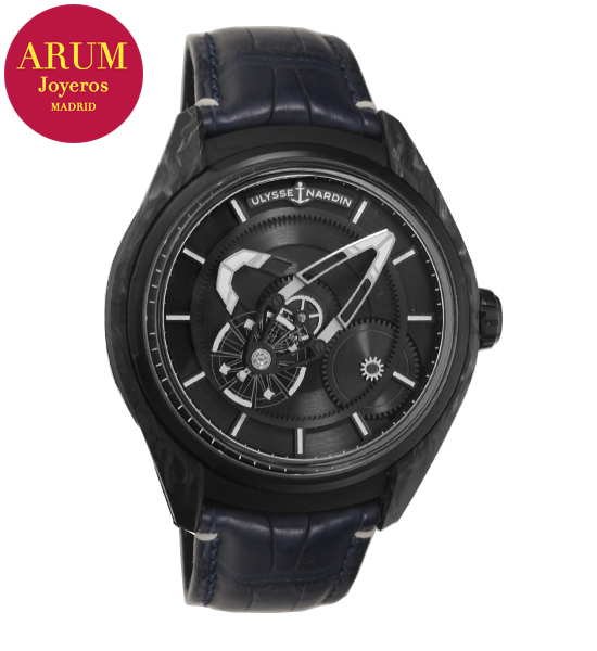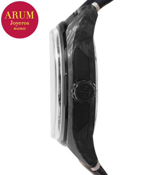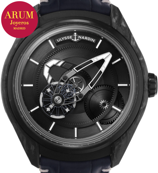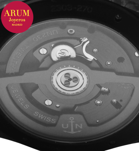 Otras especificaciones :es el primer reloj creado en el que el movimiento gira para indicar la hora. Sin esfera, sin manecillas, el movimiento es el rey a través de un oscilador único de gran diámetro que impulsa el carrusel volador que gira alrededor de su propio eje. Realizado en carbono aeronáutico es uno de los relojes más ligeros del mundo (peso total con correa y deployant incluido 76 grs.). Calibre UN-230, reserva de marcha de 72 horas, tapa trasera con cristal de zafiro, deployant realizado en titanio.