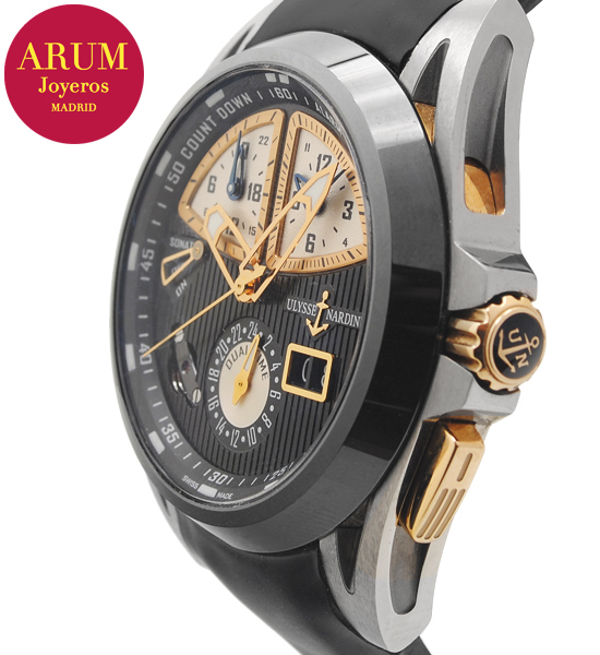 Otras especificaciones :titanio, oro rosa de 18K y bisel cerámico, calibre UN67, reserva de marcha de 42 horas, sistema de alarma que diferencia la hora am de la pm, función GMT (doble uso horario) a las seis, fecha a las cuatro, alarma on/off a las nueve, corona auxiliar a la izquierda con pulsador para activar o desactivar la alarma, segundero central, marcas luminiscentes, tapa trasera transparente. Year 2013.